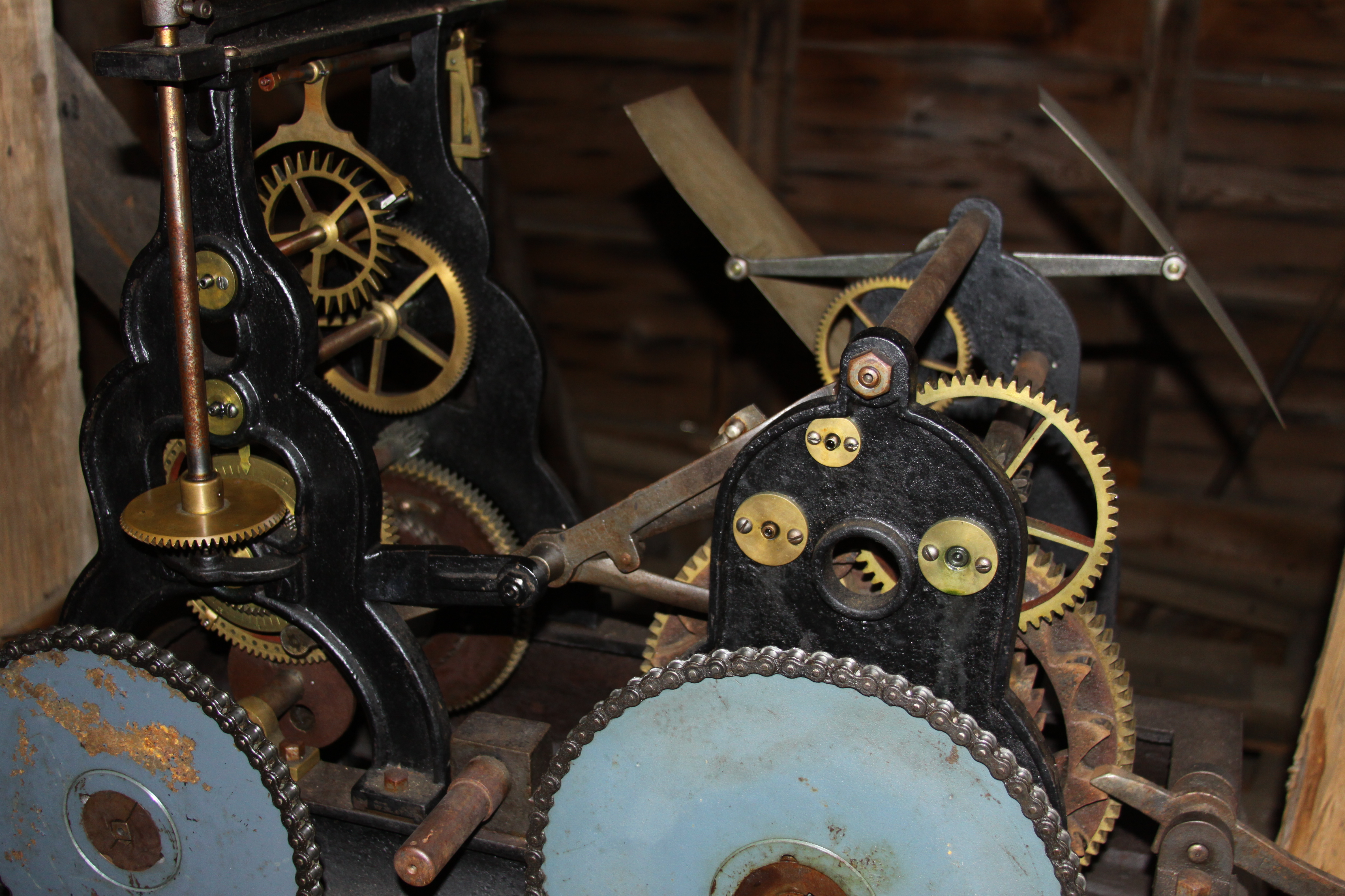 At some point in the 20th century, the box of rocks which served as the clock weight is said to have fallen through the ceiling of the tower, the ceiling of the balcony, the floor of the balcony, and the ceiling of the foyer/narthex, where it came to rest. The ropes holding it had rotted. (We still have the box of rocks, though….and I don’t mean just the box. We also have the original gear and wrench that were used to crank the box of rocks up to the top each week.) At that time, 1968, the ropes and weight were replaced and a motor installed. This motor’s only job is to pull the new weights back up to the top. Gravity still runs the clock itself.
