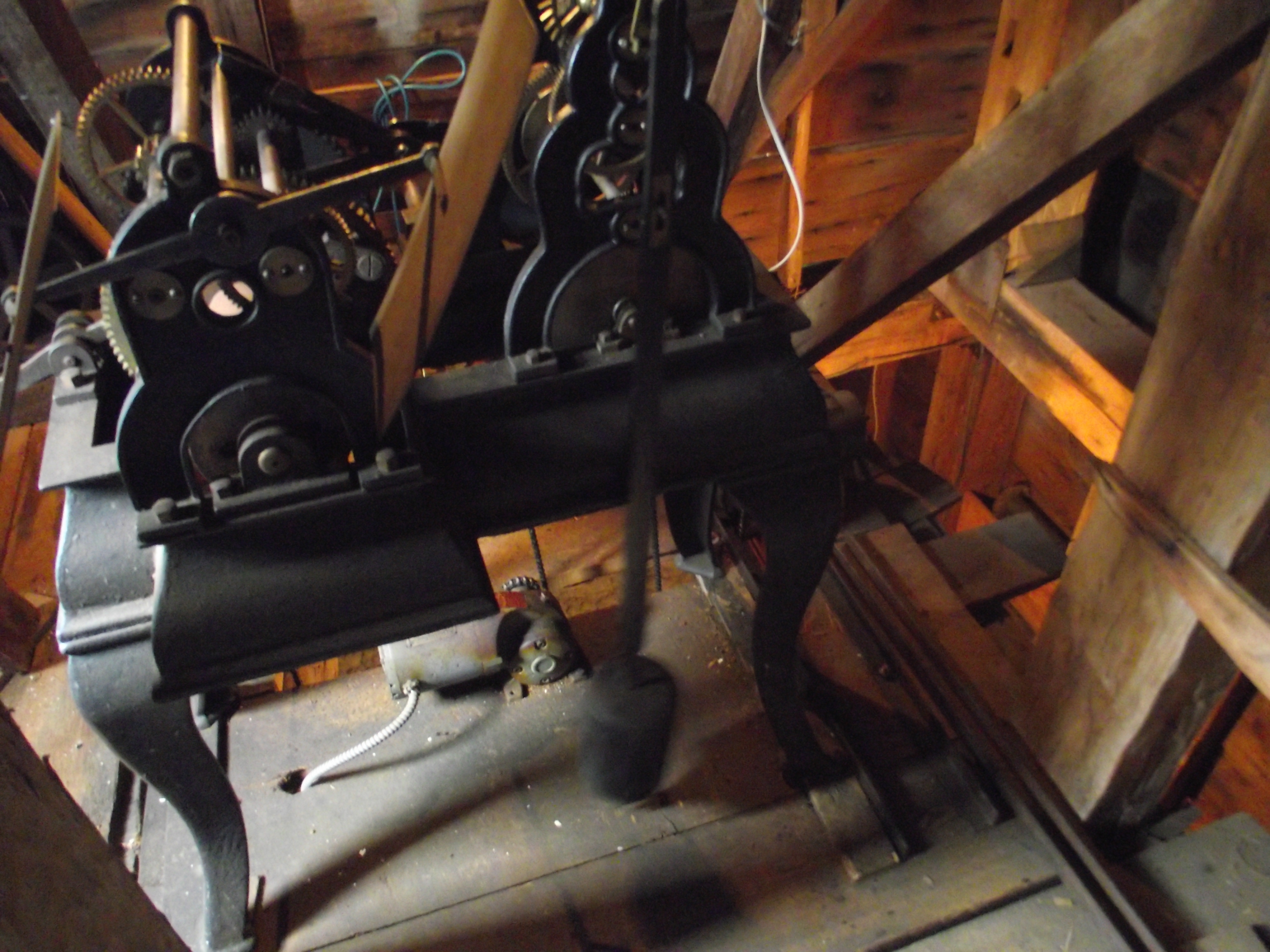 At some point in the 20th century, the box of rocks which served as the clock weight is said to have fallen through the ceiling of the tower, the ceiling of the balcony, the floor of the balcony, and the ceiling of the foyer/narthex, where it came to rest. The ropes holding it had rotted. (We still have the box of rocks, though….and I don’t mean just the box. We also have the original gear and wrench that were used to crank the box of rocks up to the top each week.) At that time, 1968, the ropes and weight were replaced and a motor installed. This motor’s only job is to pull the new weights back up to the top. Gravity still runs the clock itself.